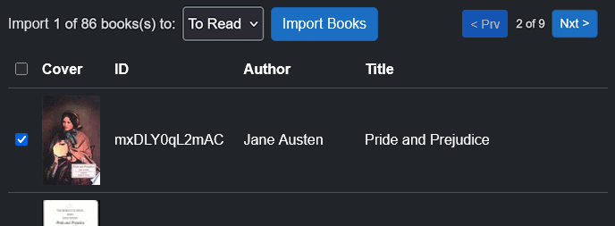 Select one or more books from the list, choose a "Collection", and click "Import Books":
