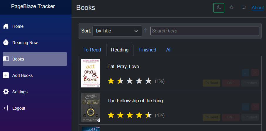 Use the "Books" page to list books, enter ratings, change collections, etc: