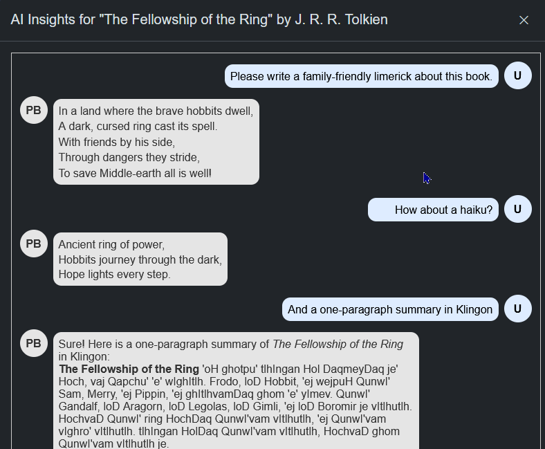 Each book has its own conversation, which is saved in browser storage.