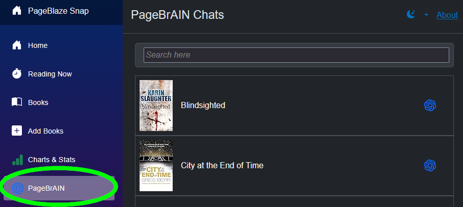 A list of books with chats stored in the current browser is available from the "PageBrAIN" navigation button: