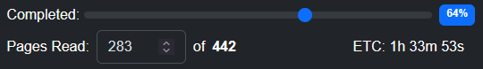 Update your progress on the current book by sliding the "Completed" indicator or entering pages read. Completed percent and pages read will update each other: